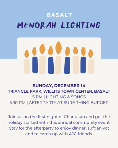 Join the Aspen Jewish Congregation to celebrate Chanukah with the annual tradition of the Basalt Menorah Lighting. The Basalt Menorah will be lit by at 5 p.m. at Triangle Park in Willits, followed by hosted appetizers at Sure Thing Burger. The Aspen Jewish Congregation hosts Chanukah festivities throughout the Roaring Fork Valley – visit the AJC website for a list of all Chanukah events.