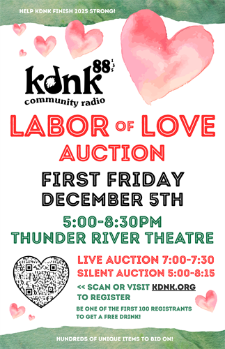Celebrate the holiday season with KDNK's annual Labor of Love auction. Bid on hundreds of items, gift certificates and more on First Friday, December 5th at Thunder River Theatre. Not able to attend in person? Fear not... The auction will continue online through December 12th.