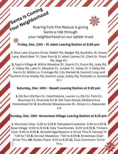 On Sunday, December 15, Santa will be leaving the Fire Station at 5:15 p.m., following this Snowmass Village neighborhood route: