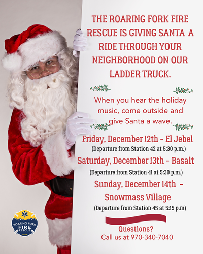 On Friday, December 12, Santa will be leaving the Fire Station at 5:30 p.m., following this Willits/El Jebel neighborhood route: